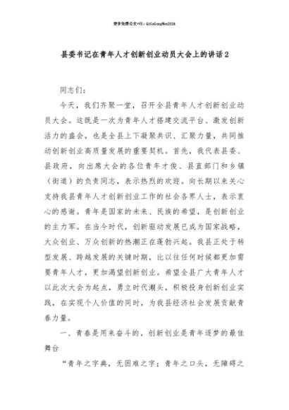 【七哥公文】2025年:【七哥公文】县委书记在青年人才创新创业动员大会上的讲话2+更多免费公文+VX:QiGeGongWen2024+更多免费公文+VX:QiGeGongWen2024