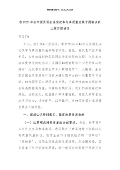 【七哥公文】2025年:【七哥公文】在2025年全市国资国企深化改革与高质量发展专题培训班上的开班讲话+更多免费公文+VX:QiGeGongWen2024+更多免费公文+VX:QiGeGongWen2024