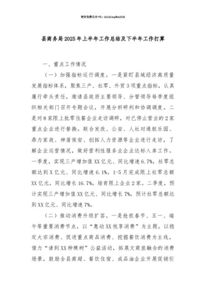 【七哥公文】2025年:【七哥公文】县商务局2025年上半年工作总结及下半年工作打算+更多免费公文+VX:QiGeGongWen2024+更多免费公文+VX:QiGeGongWen2024