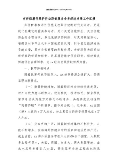 【七哥公文】2025年:【七哥公文】市侨联履行维护侨益职责服务全市经济发展工作汇报+更多免费公文+VX:QiGeGongWen2024+更多免费公文+VX:QiGeGongWen2024