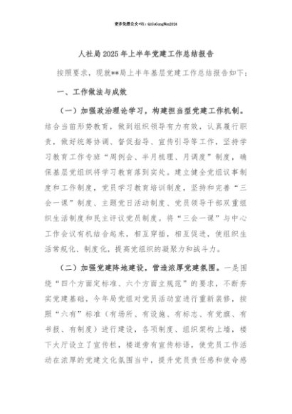 【七哥公文】2025年:【七哥公文】人社局2025年上半年党建工作总结报告+更多免费公文+VX:QiGeGongWen2024+更多免费公文+VX:QiGeGongWen2024