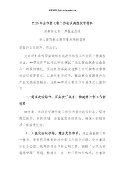 【七哥公文】2025年:【七哥公文】2025年全市林长制工作会议典型发言材料+更多免费公文+VX:QiGeGongWen2024+更多免费公文+VX:QiGeGongWen2024