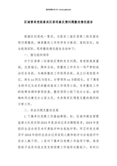 【七哥公文】2025年:【七哥公文】区城管局党组落实区委巡察反馈问题整改情况报告+更多免费公文+VX:QiGeGongWen2024+更多免费公文+VX:QiGeGongWen2024