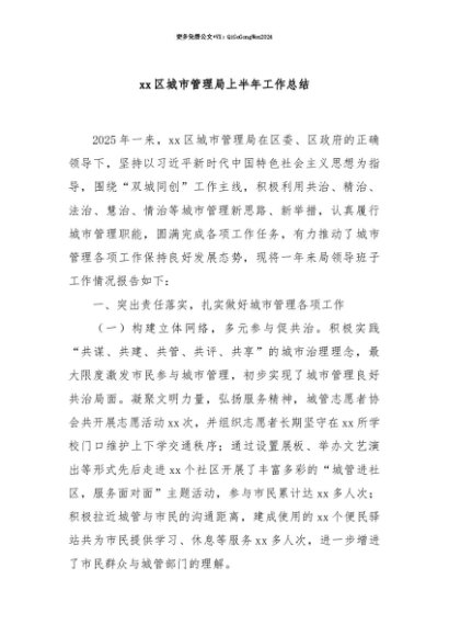 【七哥公文】2025年:【七哥公文】xx区城市管理局上半年工作总结+更多免费公文+VX:QiGeGongWen2024+更多免费公文+VX:QiGeGongWen2024