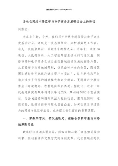 【七哥公文】2025年:【七哥公文】县长在网络市场监管与电子商务发展研讨会上的讲话+更多免费公文+VX:QiGeGongWen2024+更多免费公文+VX:QiGeGongWen2024