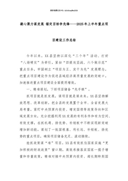 【七哥公文】2025年:【七哥公文】凝心聚力谋发展 锚定目标争先锋——2025年上半年重点项目建设工作总结+更多免费公文+VX:QiGeGongWen2024+更多免费公文+VX:QiGeGongWen2024