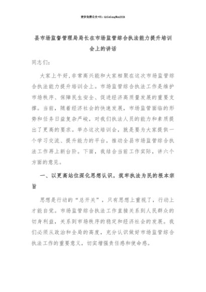 【七哥公文】2025年:【七哥公文】县市场监督管理局局长在市场监管综合执法能力提升培训会上的讲话+更多免费公文+VX:QiGeGongWen2024+更多免费公文+VX:QiGeGongWen2024