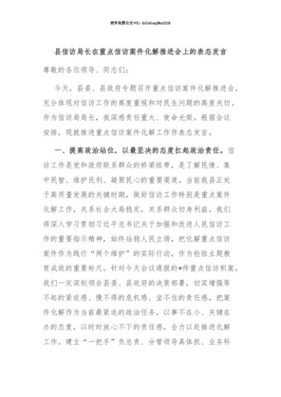 【七哥公文】2025年:【七哥公文】县信访局长在重点信访案件化解推进会上的表态发言+更多免费公文+VX:QiGeGongWen2024+更多免费公文+VX:QiGeGongWen2024