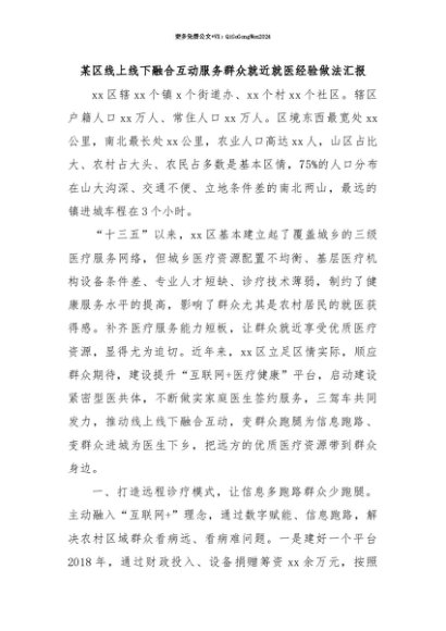 【七哥公文】2025年:【七哥公文】某区线上线下融合互动服务群众就近就医经验做法汇报+更多免费公文+VX:QiGeGongWen2024+更多免费公文+VX:QiGeGongWen2024