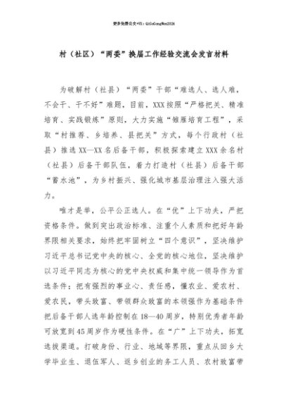 【七哥公文】2025年:【七哥公文】村(社区)“两委”换届工作经验交流会发言材料+更多免费公文+VX:QiGeGongWen2024+更多免费公文+VX:QiGeGongWen2024