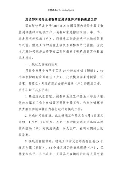 【七哥公文】2025年:【七哥公文】浅谈如何做好主要畜禽监测调查样本轮换摸底工作+更多免费公文+VX:QiGeGongWen2024+更多免费公文+VX:QiGeGongWen2024