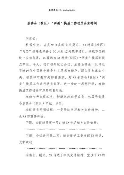 【七哥公文】2025年:【七哥公文】居委会(社区)“两委”换届工作动员会主持词+更多免费公文+VX:QiGeGongWen2024+更多免费公文+VX:QiGeGongWen2024