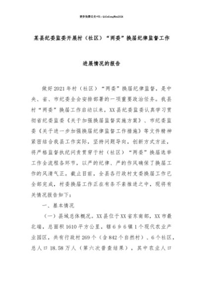 【七哥公文】2025年:【七哥公文】某县纪委监委开展村(社区)“两委”换届纪律监督工作进展情况的报告+更多免费公文+VX:QiGeGongWen2024+更多免费公文+VX:QiGeGongWen2024