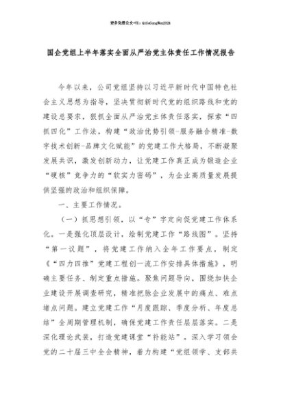 【七哥公文】2025年:【七哥公文】国企党组上半年落实全面从严治党主体责任工作情况报告(1)+更多免费公文+VX:QiGeGongWen2024+更多免费公文+VX:QiGeGongWen2024