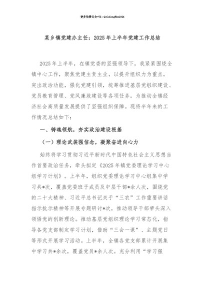 【七哥公文】2025年:【七哥公文】某乡镇党建办主任:2025年上半年党建工作总结+更多免费公文+VX:QiGeGongWen2024+更多免费公文+VX:QiGeGongWen2024