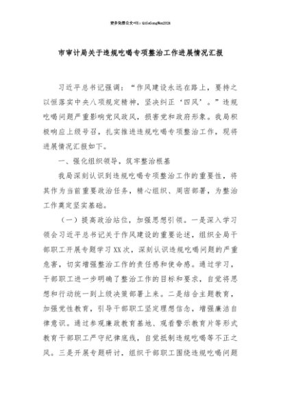 【七哥公文】2025年:【七哥公文】市审计局关于违规吃喝专项整治工作进展情况汇报+更多免费公文+VX:QiGeGongWen2024+更多免费公文+VX:QiGeGongWen2024