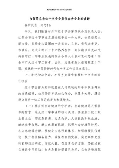 【七哥公文】2025年:【七哥公文】市领导在市红十字会会员代表大会上的讲话+更多免费公文+VX:QiGeGongWen2024+更多免费公文+VX:QiGeGongWen2024