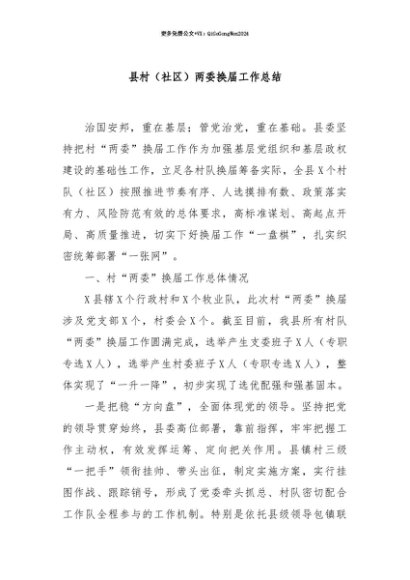 【七哥公文】2025年:【七哥公文】县村(社区)两委换届工作总结+更多免费公文+VX:QiGeGongWen2024+更多免费公文+VX:QiGeGongWen2024