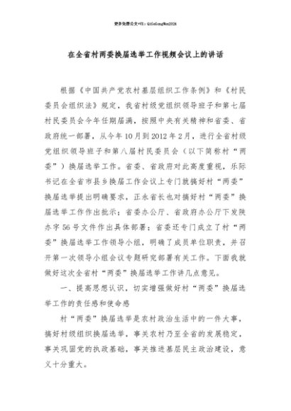 【七哥公文】2025年:【七哥公文】在全省村两委换届选举工作视频会议上的讲话+更多免费公文+VX:QiGeGongWen2024+更多免费公文+VX:QiGeGongWen2024
