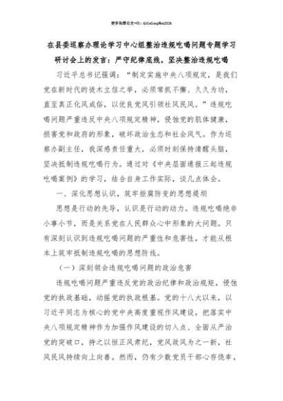 【七哥公文】2025年:【七哥公文】在县委巡察办理论学习中心组整治违规吃喝问题专题学习研讨会上的发言:严守纪律底线,坚决整治违规吃喝+更多免费公文+VX:QiGeGongWen2024+更多免费公文+VX:QiGeGongWen2024