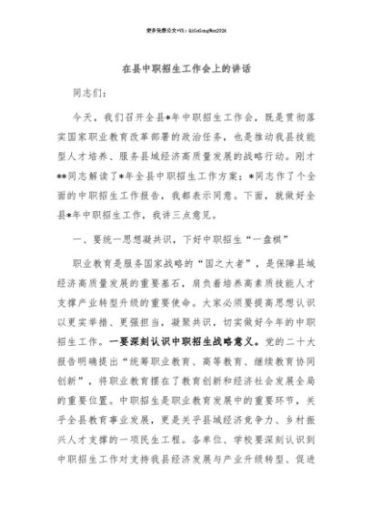 【七哥公文】2025年:【七哥公文】在县中职招生工作会上的讲话+更多免费公文+VX:QiGeGongWen2024+更多免费公文+VX:QiGeGongWen2024
