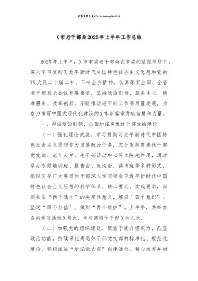 【七哥公文】2025年:【七哥公文】X市老干部局2025年上半年工作总结+更多免费公文+VX:QiGeGongWen2024+更多免费公文+VX:QiGeGongWen2024