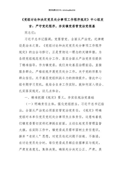 【七哥公文】2025年:【七哥公文】《党组讨论和决定党员处分事项工作程序规定》中心组发言:严守党纪程序,夯实镇党委管党治党根基+更多免费公文+VX:QiGeGongWen2024+更多免费公文+VX:QiGeGongWen2024