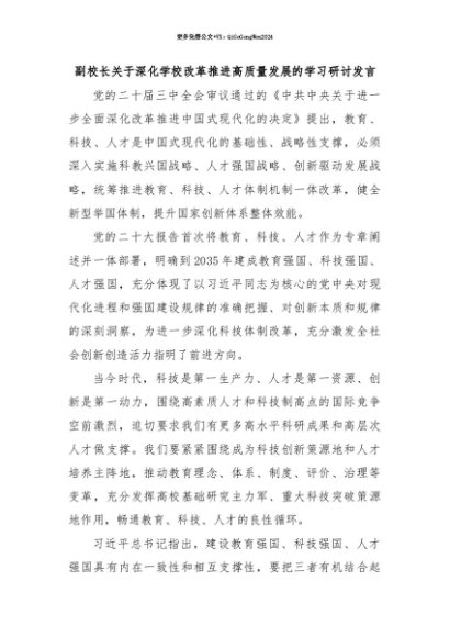 【七哥公文】2025年:【七哥公文】副校长关于深化学校改革推进高质量发展的学习研讨发言+更多免费公文+VX:QiGeGongWen2024+更多免费公文+VX:QiGeGongWen2024