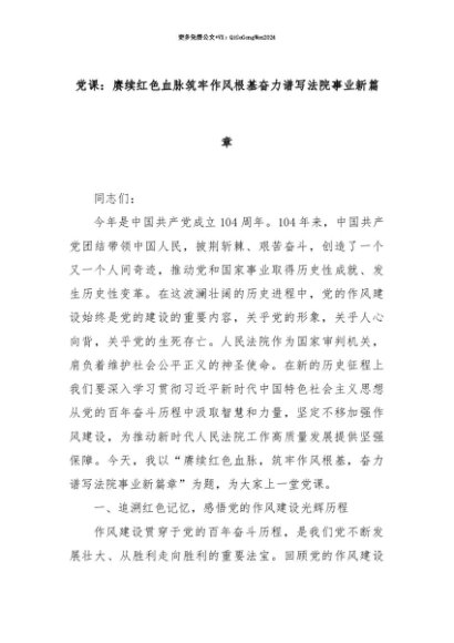 【七哥公文】2025年:【七哥公文】党课:赓续红色血脉筑牢作风根基奋力谱写法院事业新篇章+更多免费公文+VX:QiGeGongWen2024+更多免费公文+VX:QiGeGongWen2024