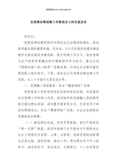 【七哥公文】2025年:【七哥公文】在党建品牌创建工作推进会上的交流发言+更多免费公文+VX:QiGeGongWen2024+更多免费公文+VX:QiGeGongWen2024