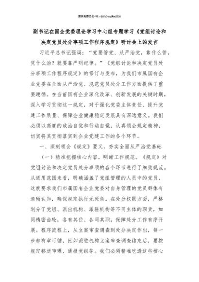 【七哥公文】2025年:【七哥公文】副书记在国企党委理论学习中心组专题学习《党组讨论和决定党员处分事项工作程序规定》研讨会上的发言+更多免费公文+VX:QiGeGongWen2024+更多免费公文+VX:QiGeGongWen2024