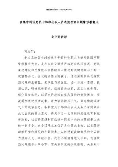 【七哥公文】2025年:【七哥公文】在集中纠治党员干部和公职人员违规饮酒问题警示教育大会上的讲话+更多免费公文+VX:QiGeGongWen2024+更多免费公文+VX:QiGeGongWen2024