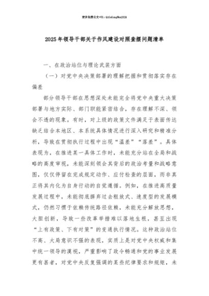【七哥公文】2025年:【七哥公文】2025年领导干部关于作风建设对照查摆问题清单+更多免费公文+VX:QiGeGongWen2024+更多免费公文+VX:QiGeGongWen2024