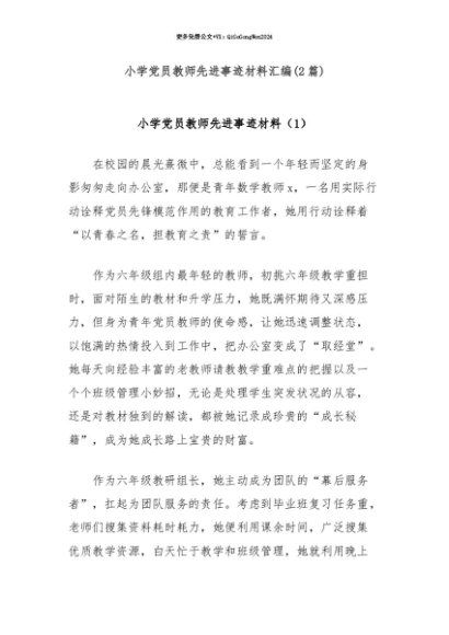 【七哥公文】2025年:【七哥公文】(2篇)小学党员教师先进事迹材料汇编+更多免费公文+VX:QiGeGongWen2024+更多免费公文+VX:QiGeGongWen2024