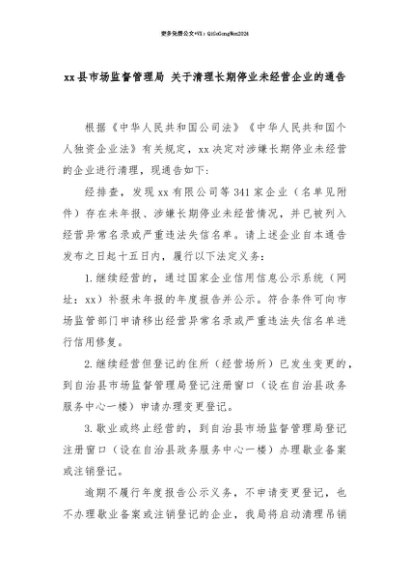 【七哥公文】2025年:【七哥公文】xx县市场监督管理局 关于清理长期停业未经营企业的通告+更多免费公文+VX:QiGeGongWen2024+更多免费公文+VX:QiGeGongWen2024