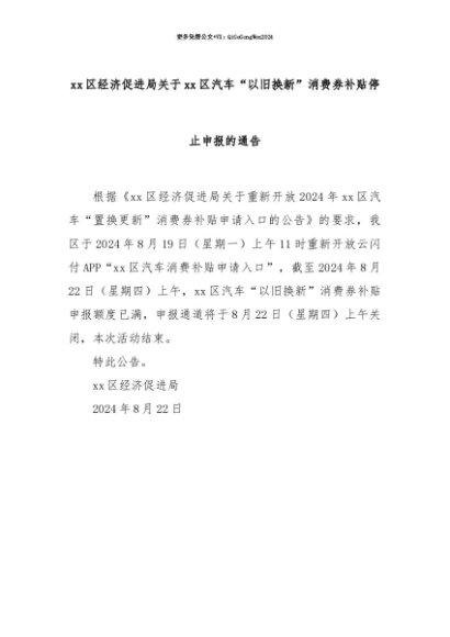 【七哥公文】2025年:【七哥公文】xx区经济促进局关于xx区汽车“以旧换新”消费券补贴停止申报的通告+更多免费公文+VX:QiGeGongWen2024+更多免费公文+VX:QiGeGongWen2024