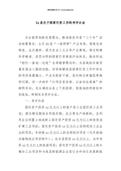 【七哥公文】2025年:【七哥公文】Xx县关于招商引资工作的考评办法+更多免费公文+VX:QiGeGongWen2024+更多免费公文+VX:QiGeGongWen2024