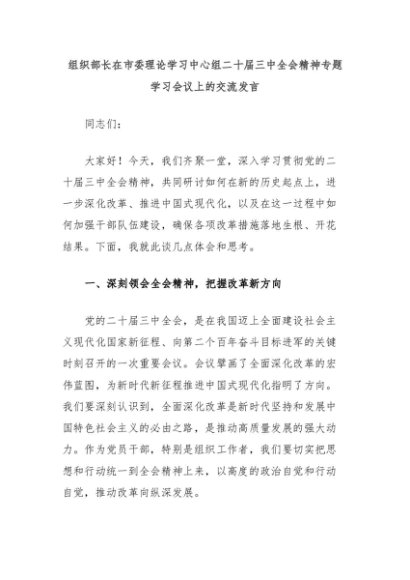 【七哥公文】2024年:组织部长在市委理论学习中心组二十届三中全会精神专题学习会议上的交流发言+更多免费公文+VX:QiGeGongWen2024