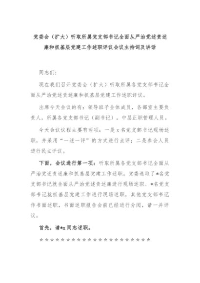 【七哥公文】2024年:党委会(扩大)听取所属党支部书记全面从严治党述责述廉和抓基层党建工作述职评议会议主持词及讲话+更多免费公文+VX:QiGeGongWen2024