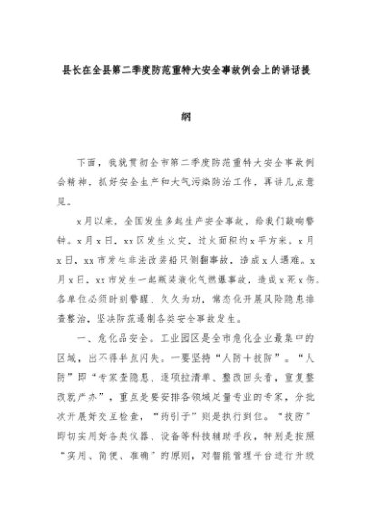 【七哥公文】2024年:县长在全县第二季度防范重特大安全事故例会上的讲话提纲+更多免费公文+VX:QiGeGongWen2024