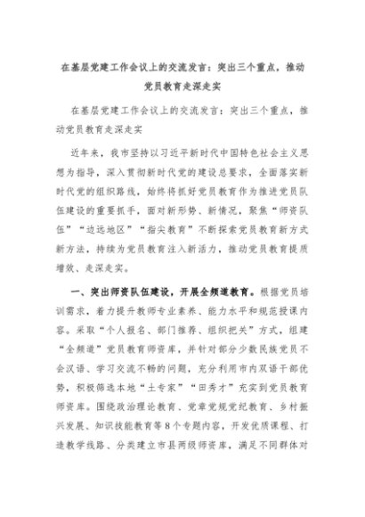 【七哥公文】2024年:在基层党建工作会议上的交流发言:突出三个重点,推动党员教育走深走实+更多免费公文+VX:QiGeGongWen2024