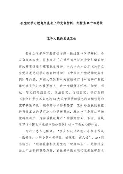 【七哥公文】2024年:在党纪学习教育交流会上的发言材料:纪检监察干部要做党和人民的忠诚卫士+更多免费公文+VX:QiGeGongWen2024