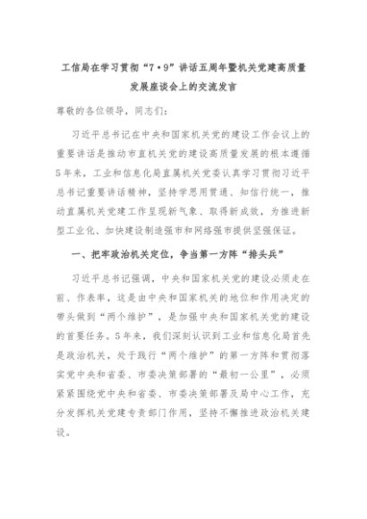 【七哥公文】2024年:工信局在学习贯彻“7·9”讲话五周年暨机关党建高质量发展座谈会上的交流发言+更多免费公文+VX:QiGeGongWen2024