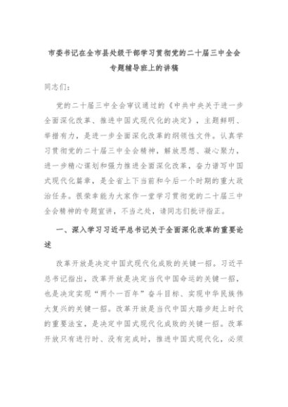 【七哥公文】2024年:市委书记在全市县处级干部学习贯彻党的二十届三中全会专题辅导班上的讲稿+更多免费公文+VX:QiGeGongWen2024