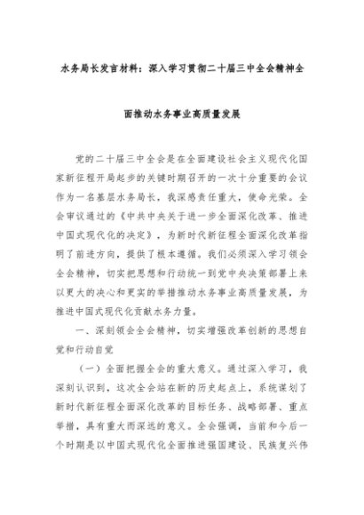 【七哥公文】2024年:水务局长发言材料:深入学习贯彻二十届三中全会精神全面推动水务事业高质量发展+更多免费公文+VX:QiGeGongWen2024