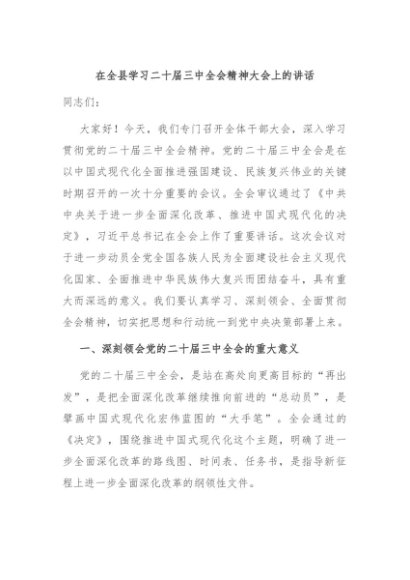 / 【七哥公文】2024年:在全县学习二十届三中全会精神大会上的讲话+更多免费公文+VX:QiGeGongWen2024