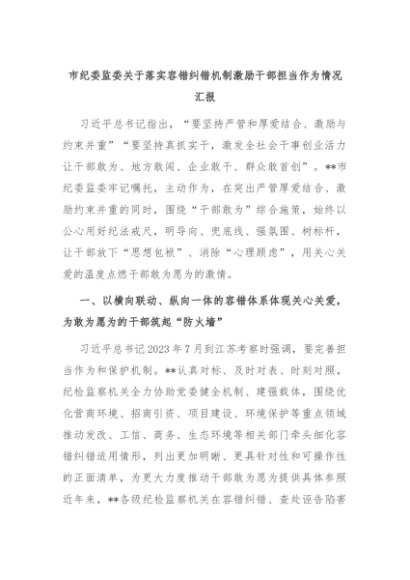 【七哥公文】2024年:市纪委监委关于落实容错纠错机制激励干部担当作为情况汇报+更多免费公文+VX:QiGeGongWen2024
