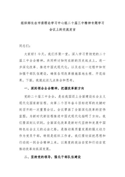 【七哥公文】2024年:组织部长在市委理论学习中心组二十届三中精神专题学习会议上的交流发言+更多免费公文+VX:QiGeGongWen2024