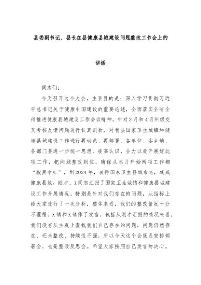 【七哥公文】2024年:县委副书记、县长在县健康县城建设问题整改工作会上的讲话+更多免费公文+VX:QiGeGongWen2024