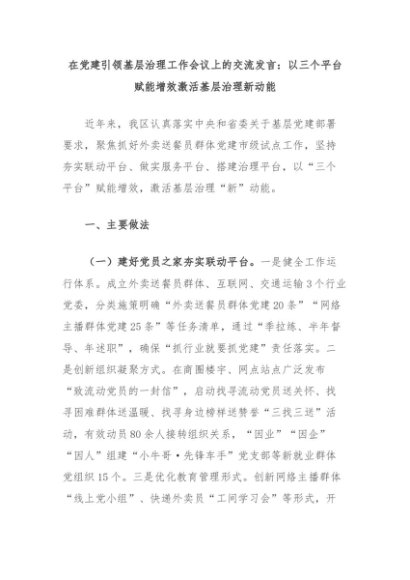 【七哥公文】2024年:在党建引领基层治理工作会议上的交流发言:以三个平台赋能增效激活基层治理新动能+更多免费公文+VX:QiGeGongWen2024